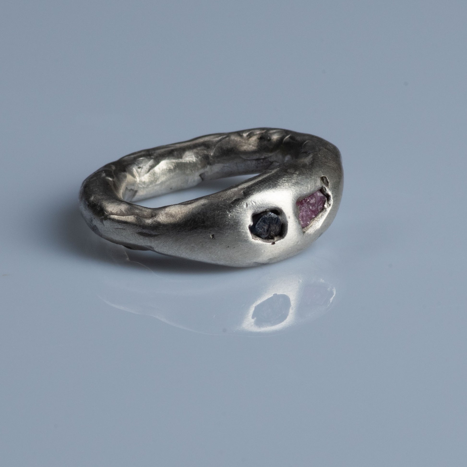 Sterling Silver Ring with Raw Ruby and Raw Sapphire "Opposites Attract"