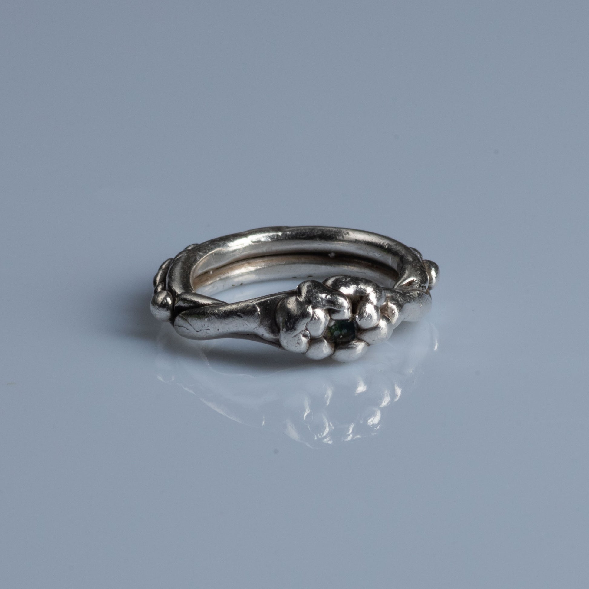 Unique handmade ring crafted from 925 sterling silver accentuated with an oxidized finish. Oxidation enhances the organic texture providing depth and character to this timeless piece. Embedded in bubbly silver lies a shiny emerald, symbolizing growth, renewal and healing. "Smaragdus", means green in ancient greek and refers to the gemstones radiant colour. It is the birthstone for May and therefor matching Taurus. With an ending comes a new beginning.