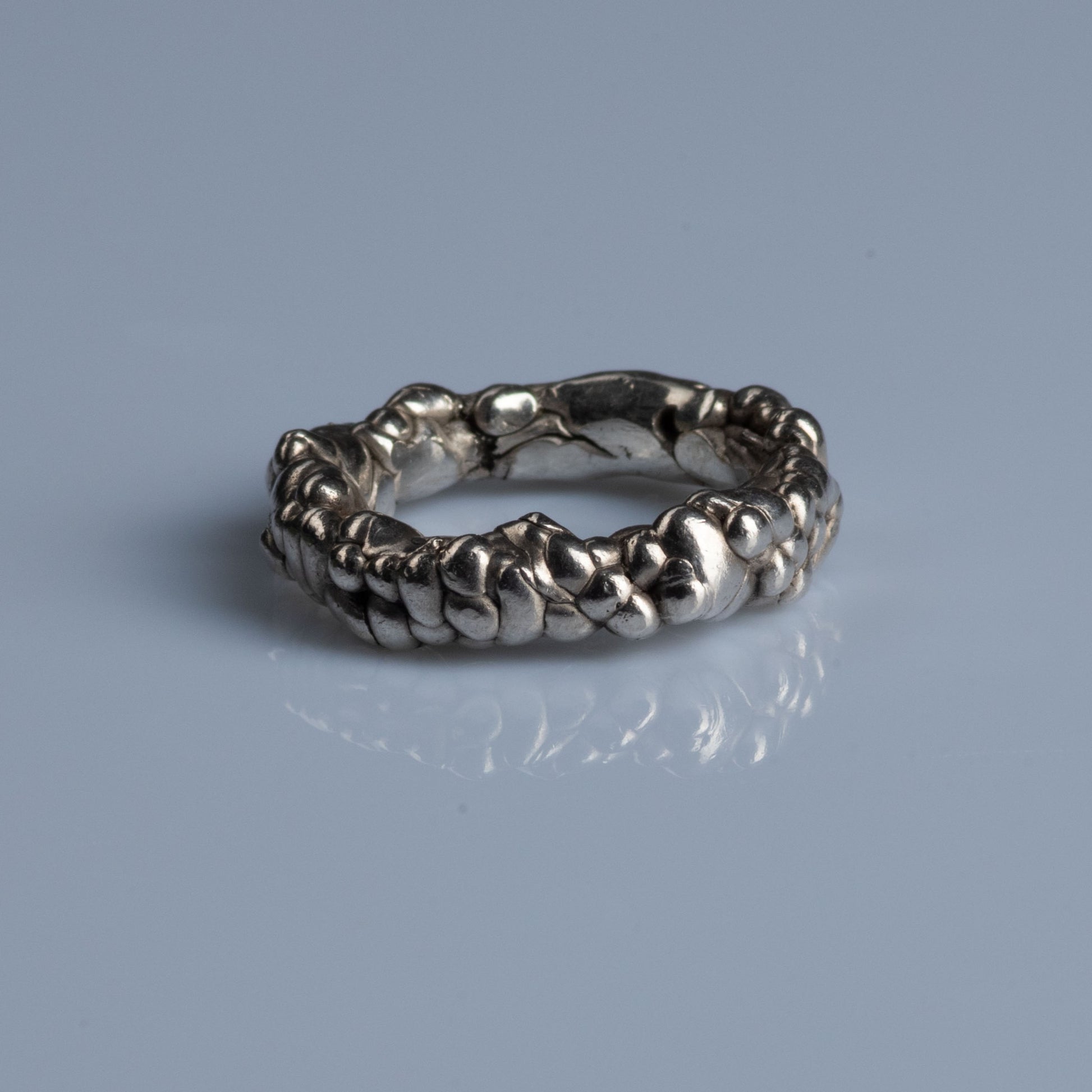 Unique handmade ring crafted from 925 sterling silver accentuated with an oxidized finish. Oxidation enhances the organic texture providing depth and character to this timeless piece. Inspired by natural growth patterns and crafted through a time intensive process this ring resembles resilience and the strength to become what one is meant to be.