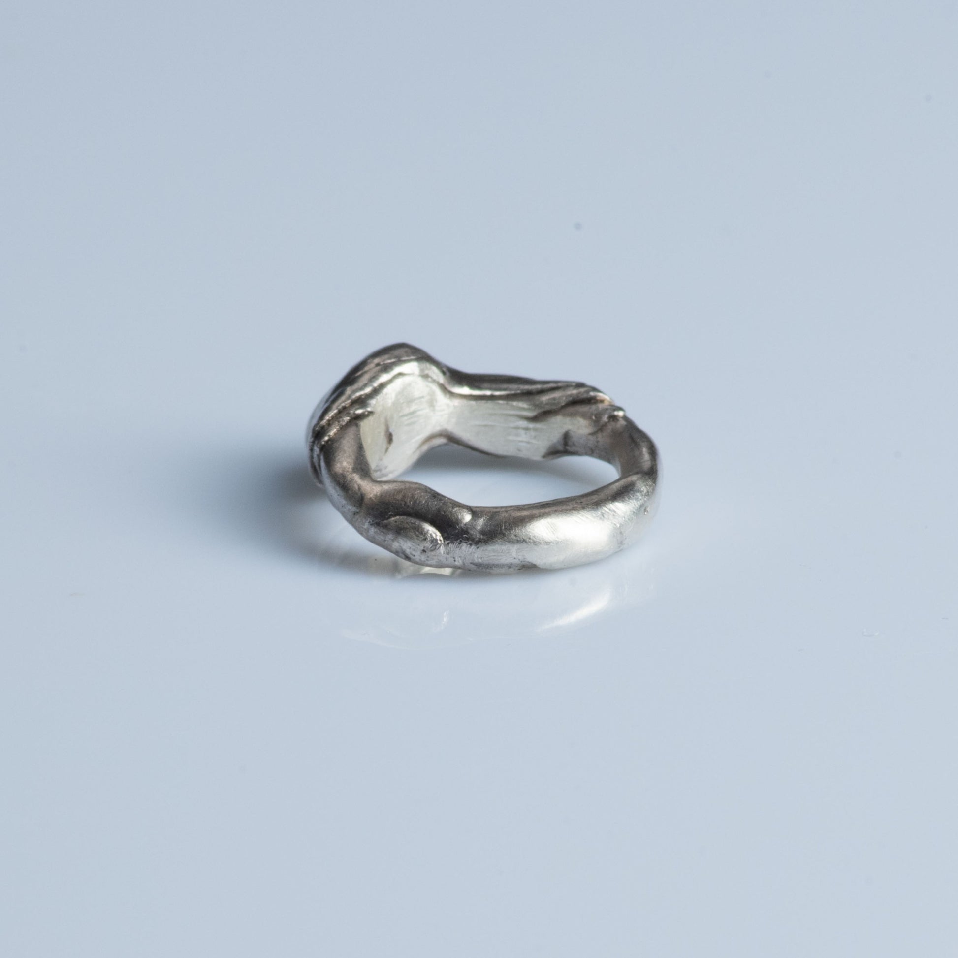 Unique handmade ring crafted from 925 sterling silver accentuated with an oxidized finish. Oxidation enhances the organic texture providing depth and character to this timeless piece. Inspired by the moving of time, one day we will be a layer in the earths crust and somebody will find some body wearing this ring. Until we rest may life be full of quests.