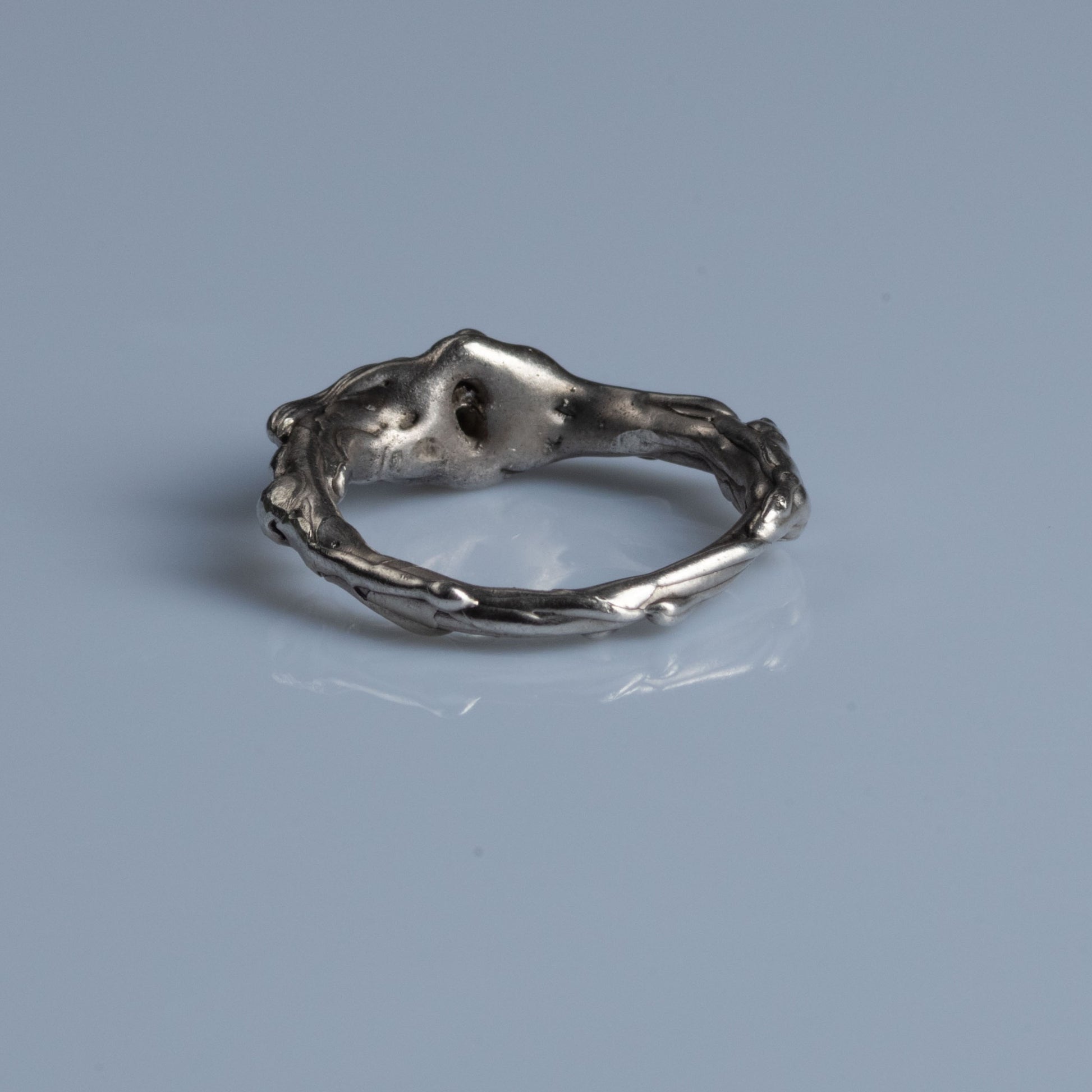 Unique handmade ring crafted from 925 sterling silver accentuated with an oxidized finish. Oxidation enhances the organic texture providing depth and character to this timeless piece. Embedded within the silver, covered by it, is a round brilliant cut diamond, symbolizing clarity and strenght. This particular diamond has a matte patina created by a thin silver coating. Being the hardest gemstone in the world, it represents invincibility, power and purity, the birthstone of April and Aries. Significant life milestones might be showcased through this gemstone.